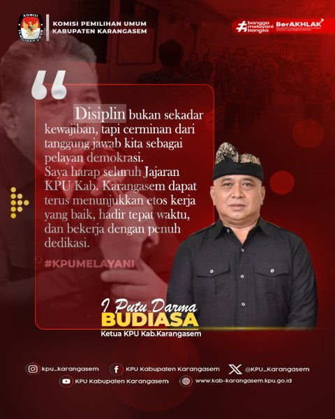Berikut penjelasan dari Ketua KPU Kabupaten Karangasem, I Putu Darma Budiasa terkait kedisiplinan. "Disiplin bukan sekadar kewajiban, tapi cerminan dari tanggung jawab kita sebagai pelayan demokrasi. Saya harap seluruh Jajaran KPU Kabupaten Karangasem dapat terus menunjukkan etos kerja yang baik, hadir tepat waktu, dan bekerja dengan penuh dedikasi".
