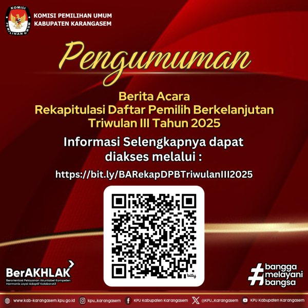 Berikut disampaikan informasi terkait Keputusan Komisi Pemilihan Umum Kabupaten Karangasem Nomor 36 Tahun 2025 tentang Penetapan Rekapitulasi Pemutakhiran Data Pemilih Berkelanjutan Kabupaten Karangasem Provinsi Bali Triwulan III Tahun 2025. Informasi lebih lanjut dapat dilihat melalui tautan : https://bit.ly/KptKPUKabKarangasem36Th2025 atau dengan memindai QR Code pada gambar. ....