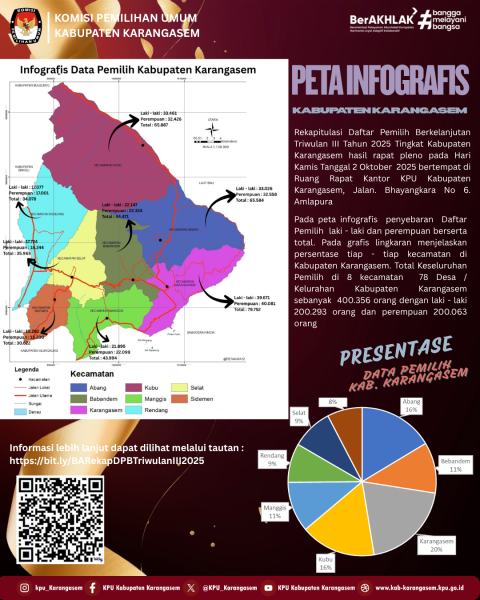Berikut disampaikan informasi terkait Infografis Data Pemilih Berkelanjutan Triwulan III Tahun 2025 Komisi Pemilihan Umum Kabupaten Karangasem. Berdasarkan hasil Rapat Pleno Terbuka Daftar Pemilih Berkelanjutan Triwulan III Tahun 2025, total keseluruhan Pemilih di 8 Kecamatan, 78 Desa/Kelurahan Kabupaten Karangasem sebanyak 400.356 orang dengan Pemilih Laki-Laki sebanyak 200.293 orang dan Pemilih Perempuan sebanyak 200.063 orang. Informasi lebih lanjut dapat dilihat melalui tautan : https://bit.ly/BARekapDPBTriwulanIII2025 atau dengan memindai QR Code pada gambar. ....