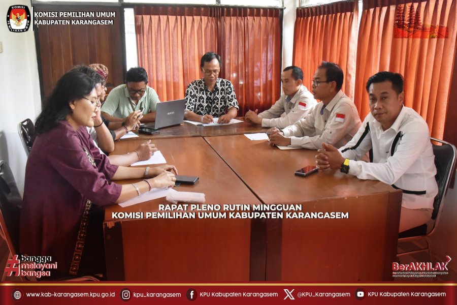 Komisi Pemilihan Umum Kabupaten Karangasem melaksanakan Rapat Pleno Rutin Mingguan di Ruang Rapat KPU Kabupaten Karangasem, Selasa (30/9). Rapat dipimpin oleh Anggota KPU Kabupaten Karangasem, I Gede Budana, Agus Nugroho Purwanto & I Kadek Sukara. Rapat dihadiri oleh Kepala Sub Bagian KPU Kabupaten Karangasem didampingi jajaran Staf. Pertemuan tersebut membahas evaluasi dari program/rencana kerja sebelumnya dan rencana kerja KPU Kabupaten Karangasem seminggu kedepan. ....