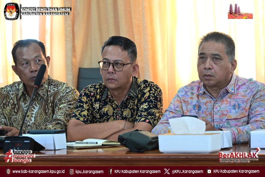 Komisi Pemilihan Umum Kabupaten Karangasem melaksanakan Rapat Pleno Terbuka Rekapitulasi Daftar Pemilih Berkelanjutan Triwulan III Tahun 2025 di Ruang Rapat KPU Kabupaten Karangasem, Kamis (2/10). Rapat dibuka dengan sambutan dari Ketua KPU Kabupaten Karangasem, I Putu Darma Budiasa sekaligus menuturkan bahwa pemutakhiran daftar pemilih berkelanjutan merupakan kegiatan yang secara kontinu dilakukan oleh KPU Kabupaten/Kota meskipun diluar tahapan Pemilu dan Pilkada demi meningkatkan akurasi dan kesesuaian daftar pemilih kedepannya. Selanjutnya, Anggota KPU Kabupaten Karangasem, Agus Nugroho Purwanto menyampaikan hasil rekapitulasi daftar pemilih berkelanjutan Triwulan III Tahun 2025 bersama Admin dan Operator SIDALIH KPU Kabupaten Karangasem. Rapat Pleno Terbuka dihadiri oleh jajaran Komisi Pemilihan Umum Kabupaten Karangasem, perwakilan Polres Karangasem, perwakilan Kodim 1623 Karangasem, perwakilan Dinas Kependudukan dan Pencatatan Sipil Kabupaten Karangasem, perwakilan Dinas Ketenagakerjaan Kabupaten Karangasem, Perwakilan Dinas Pemberdayaan Masyarakat dan Desa Kabupaten Karangasem, Anggota Badan Pengawas Pemilihan Umum Kabupaten Karangasem serta Petugas Penghubung Partai Politik se-Kabupaten Karangasem. ....