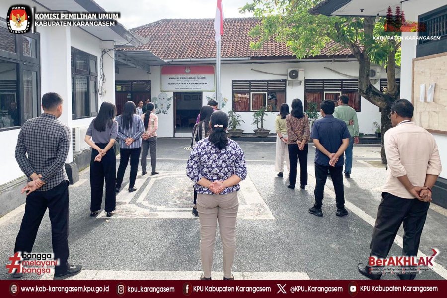 Komisi Pemilihan Umum Kabupaten Karangasem melaksanakan Apel Pagi di Kantor KPU Kabupaten Karangasem, Kamis (2/10). Bertindak sebagai Pembina Apel, Kepala Sub Bagian Teknis Penyelenggaraan Pemilu dan Hukum KPU Kabupaten Karangasem, I Nyoman Orta Susila menyampaikan kepada jajaran untuk menjaga kedisiplinan, kesehatan, integritas dan semangat serta kekompakan dalam melaksanakan tugas. Orta Susila turut mengimbau untuk menjaga kebersihan kantor sekaligus mendukung pelaksanaan kegiatan, khususnya pada Rapat Pleno Terbuka Rekapitulasi Daftar Pemilih Berkelanjutan Triwulan III Tahun 2025 pada 10:00 WITA nanti. ....