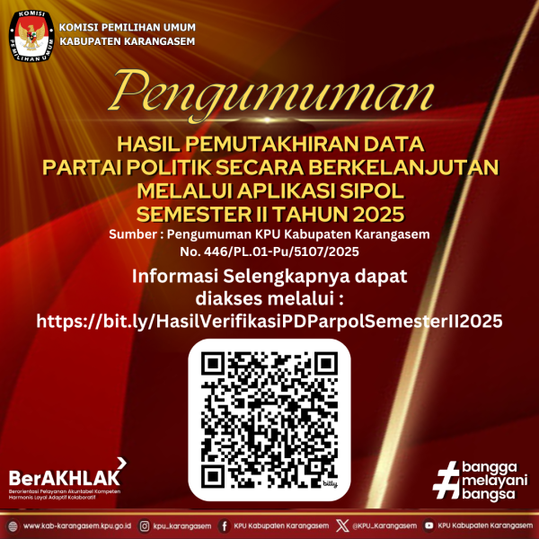 Berdasarkan Pengumuman Komisi Pemilihan Umum Kabupaten Karangasem No. 446/PL.01-Pu/5107/2025 berikut disampaikan Pengumuman terkait Hasil Pemutakhiran Data dan Dokumen Partai Politik Secara Berkelanjutan melalui Aplikasi SIPOL Semester II Tahun 2025. Informasi lebih lanjut dapat diakses melalui tautan https://bit.ly/HasilVerifikasiPDParpolSemesterII2025 atau dengan memindai QR Code pada gambar. ....