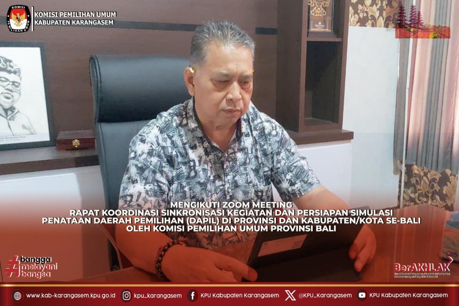 Amlapura, kab-karangasem.kpu.go.id - Komisi Pemilihan Umum Kabupaten Karangasem mengikuti Zoom Meeting Rapat Koordinasi Sinkronisasi Kegiatan dan Persiapan Simulasi Penataan Dapil di Provinsi dan Kabupaten/Kota se-Bali yang digelar oleh Komisi Pemilihan Umum Provinsi Bali, Kamis (12/2/2026). Rapat diawali dengan sambutan dari Ketua KPU Provinsi Bali, I Dewa Agung Gede Lidartawan sekaligus menyampaikan arahan kepada jajaran KPU Kabupaten/Kota untuk dapat memahami materi yang disampaikan sebagai bahan persiapan dalam penataan daerah pemilihan pada Pemilu yang akan datang. Selanjutnya Anggota KPU Provinsi Bali, Luh Putu Sri Widyastini memberikan penjelasan terkait teknis dan mekanisme penyusunan daerah pemilihan menekankan kepada KPU Kabupaten/Kota Se-Bali untuk berkoordinasi dengan instansi terkait agar dapat menyampaikan ketentuan penyusunan dapil sudah sesuai dengan ketentuan dan peraturan lainnya. Materi berlanjut dengan Sinkronisasi Kegiatan Teknis Kepemiluan Tahun 2026 oleh Kepala Bagian Teknis Penyelenggaraan Pemilu, Partisipasi dan Hubungan Masyarakat, Hukum dan Sumber Daya Manusia KPU Provinsi Bali, I Gusti Gede Made Gustem Lasida serta Sekretaris KPU Provinsi Bali, I Made Oka Purnama yang menyatakan KPU Provinsi dan KPU Kabupaten/Kota Se-Bali dapat mendukung sepenuhnya rangkaian kegiatan Teknis Kepemiluan tersebut tanpa terkendala anggaran. ....
