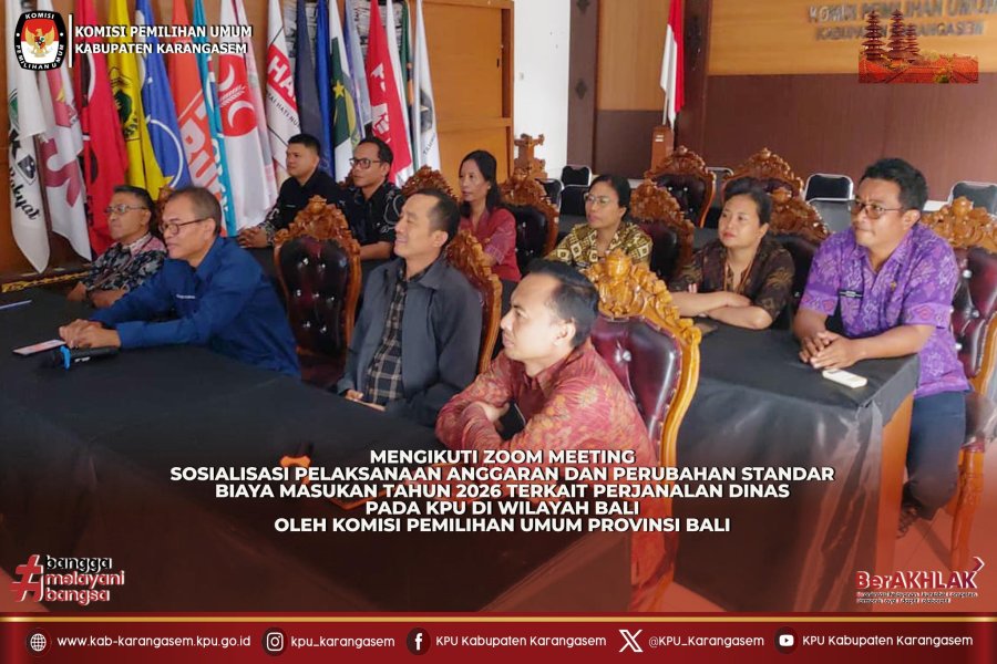 Amlapura, kab-karangasem.kpu.go.id - Target Tanpa Pengembalian KPU Karangasem Ikuti Sosialisasi Pelaksanaan Anggaran Tahun 2026, KPU Provinsi Bali menargetkan tanpa ada pengembalian anggaran pada pelaksanaan anggaran tahun 2026. Hal itu disampaikan Ketua KPU Bali, I Dewa Agung Gede Lidartawan saat membuka zoom sosialisasi pelaksanaan anggaran tahun 2026 dan perubahan standar biaya masuk (SBM) tahun 2026 yang mengatur perjalanan dinas pada KPU di wilayah Bali. Sementara itu KPU Kabupaten Karangasem ikut aktif mengikuti sosialisasi pelaksanaan anggaran tahun 2026. Dalam arahannya mantan Ketua KPU Bangli, tidak ingin kejadian serupa terjadi kembali pada tahun 2026 ini. Komitmen agar tidak terjadi pengembalian lagi, terutama mengenai SBM. "Kita samakan persepsi dulu, agar ada pemahaman yang sama di semua satker Kabupaten/Kota," tegas Lidartawan. Lidartawan menambahkan semua aplikasi sekarang sudah dibuat ngelink langsung dengan sistem. Termasuk tukin, absen pegawai semua itu nge-link dengan sistem. "Perubahan standar masuk dan perjalanan dinas saya tidak ingin ada pengembalian lagi. Makanya, pemahaman kita harus sama, semua satker berguru ke provinsi dan ke pusat," tegas Lidartawan. Kegiatan dilanjutkan dengan pembahasan terkait Standar Biaya Masukan (SBM) yang disampaikan oleh perwakilan Biro Keuangan Komisi Pemilihan Umum Republik Indonesia, Dicky Kurniawan yang diantaranya menekankan kepada jajaran KPU Se-Provinsi Bali untuk menyesuaikan kegiatan dengan anggaran yang telah dikelola satker masing-masing agar tidak menjadi temuan dan melakukan pengembalian lagi. Segala perubahan dalam pembiayaan tersebut dilakukan dalam rangka meningkatkan efisiensi dalam pengelolaan anggaran dan mensukseskan kegiatan tanpa kendala berarti. Selanjutnya disampaikan penjelasan terkait Permasalahan Perjalanan Dinas Dalam Negeri di Lingkungan Komisi Pemilihan Umum oleh perwakilan Inspektorat Wilayah II KPU Republik Indonesia yang mengingatkan kembali kepada jajaran KPU Provinsi dan KPU Kabupaten/Kota Se-Bali untuk memperhatikan ketentuan dan mengumpulkan dokumen pendukung perjalanan dinas seperti bukti pembayaran BBM, bukti pembayaran penginapan dan pembayaran lainnya sesuai dalam ketentuan perjalanan dinas yang berlaku. Kegiatan dilanjutkan dengan tanya jawab yang dimoderatori oleh Kepala Bagian Keuangan, Umum dan Logistik KPU Provinsi Bali, Santi Chovarida. ....