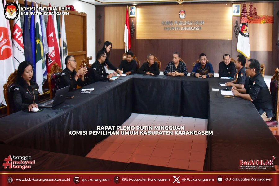 Amlapura, kab-karangasem.kpu.go.id - Komisi Pemilihan Umum Kabupaten Karangasem melaksanakan Rapat Pleno Rutin Mingguan sebagai media koordinasi, perencanaan serta proses evaluasi dan sinkronisasi terhadap kinerja satker. Pertemuan ini digelar di Ruang Rapat KPU Kabupaten Karangasem pada Rabu (18/2/2026). Rapat pleno dipimpin oleh Ketua KPU Kabupaten Karangasem, I Putu Darma Budiasa didampingi para Anggota, Plt. Sekretaris dan Kepala Sub Bagian KPU Kabupaten Karangasem. Setelah pembukaan dan arahan oleh Ketua KPU Kabupaten Karangasem, Plt. Sekretaris menjelaskan kegiatan dan agenda yang sudah dan belum dilaksanakan, dilanjutkan dengan penjelasan masing-masing Ketua Divisi terkait rencana kegiatan yang akan dilaksanakan seminggu kedepan. Pada pertemuan ini, KPU Kabupaten Karangasem mengevaluasi hasil pelaksanaan tugas dan kegiatan yang sudah dan belum dilaksanakan, utamanya terkait persiapan pelaksanaan perjanjian kerja sama antar lembaga, audiensi dengan Kepala Kejaksaan Negeri Karangasem dan Dandim 1623 Kabupaten Karangasem. Tak lupa disampaikan kepada jajaran untuk perubahan jam kerja pada Bulan Ramadhan kedepan. Rapat diakhiri dengan berdoa bersama mengharap seluruh agenda dapat terlaksana dengan baik dan diberi keberhasilan, keselamatan serta kesehatan. ....