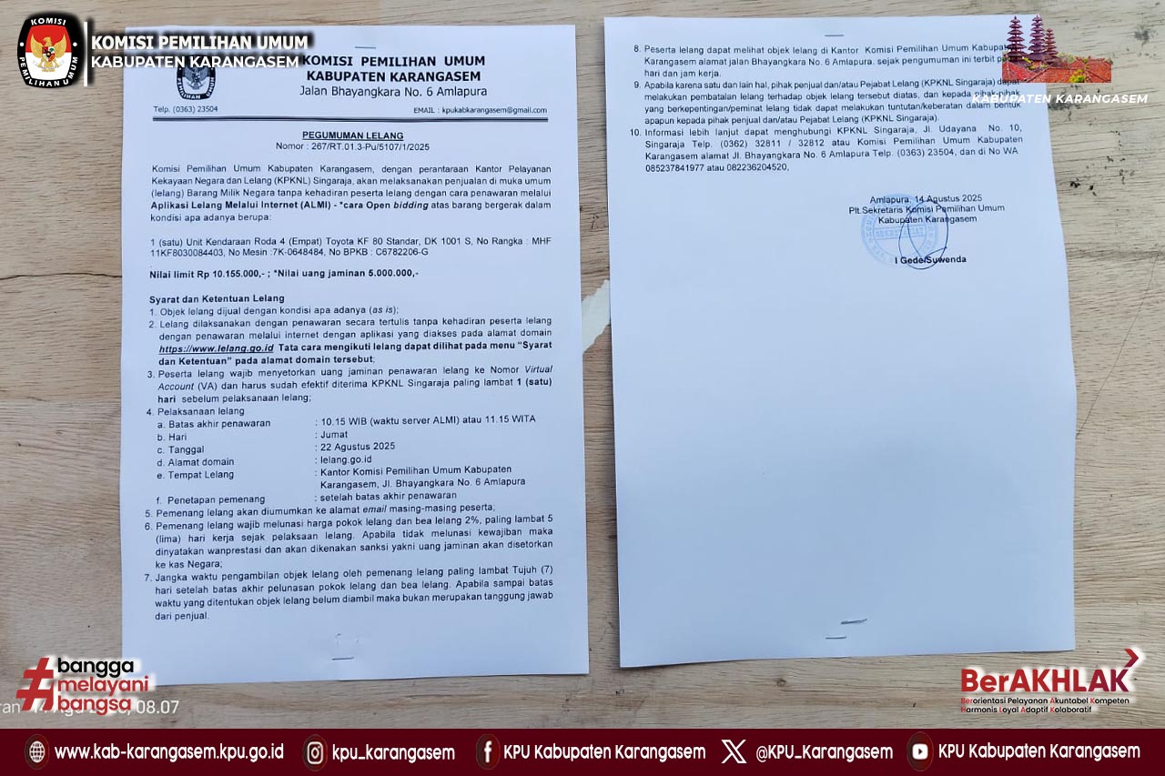 Komisi Pemilihan Umum Kabupaten Karangasem melaksanakan penempelan pengumuman Lelang Barang Milik Negara (BMN) No. 267/RT.01.3-Pu/5107/1/2025, Kamis (14/8).