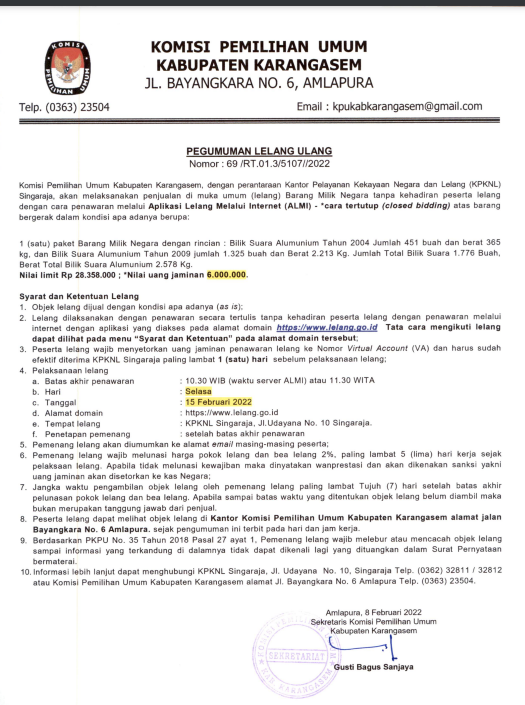 Pengumuman Lelang Ulang Nomor :69/T.01.3/5107/2022