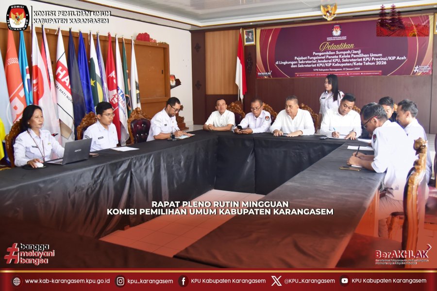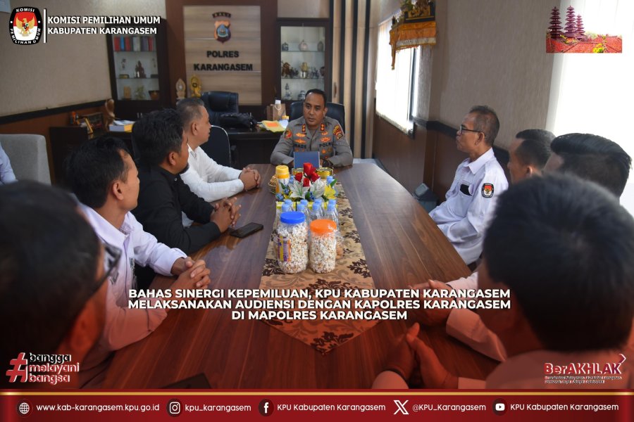 #TemanPemilih, Komisi Pemilihan Umum Kabupaten Karangasem melaksanakan Audiensi dengan Kapolres Karangasem bertempat di Mapolres Karangasem. Senin (26/1/2026). Kedatangan Ketua KPU Kabupaten Karangasem, I Putu Darma Budiasa bersama jajaran Komisioner, Agus Nugroho Purwanto, I Gede Budana, I Kadek Sukara, I Wayan Suartika serta jajaran Sekretariat, Plt. Sekretaris KPU Kabupaten Karangasem, I Gede Suwenda, dan Kepala Sub Bagian KPU Kabupaten Karangasem, I Gusti Agung Bagus Prihartana dan I Gede Wira Hadibrata Putra diterima oleh Kapolres Karangasem, AKBP I Made Santika, S.H.,S.I.K,M.I.K di ruangan. Pada kesempatan itu, Putu Darma menyampaikan kepada Kapolres Karangasem bahwa visitasi tersebut bertujuan untuk memperkenalkan diri sehubungan dengan rotasi Kapolres Karangasem pada Kamis (8/1/2026) lalu. "Kedatangan kami kemari adalah untuk perkenalan jajaran KPU Kabupaten Karangasem dengan Kapolres setelah adanya rotasi atau penggantian jabatan beberapa waktu lalu", ujar Putu Darma. Selain itu, mantan PPK Rendang itu juga berharap pertemuan ini dapat menjadi momen meningkatkan hubungan antar lembaga juga sinergitas dalam mensukseskan agenda kepemiluan. "Setelah ini, saya harap KPU dan Polres Karangasem bisa beriringan dalam mengawal, mengamankan, dan memastikan terwujudnya setiap agenda kepemiluan", harap Putu Darma. Kapolres Karangasem AKBP I Made Santika merespon dengan optimis penyampaian dari jajaran KPU Kabupaten Karangasem. Made Santika menyatakan siap membantu dalam pelaksanaan agenda kepemiluan yang memerlukan peran serta kepolisian. "Kami jajaran Polres Karangasem tentu selalu siap membantu, terutama dalam mengawal dan menjaga keamanan agar pelaksanaan pemilu dan pemilihan berjalan sesuai dengan ketentuan", tegas Made Santika.