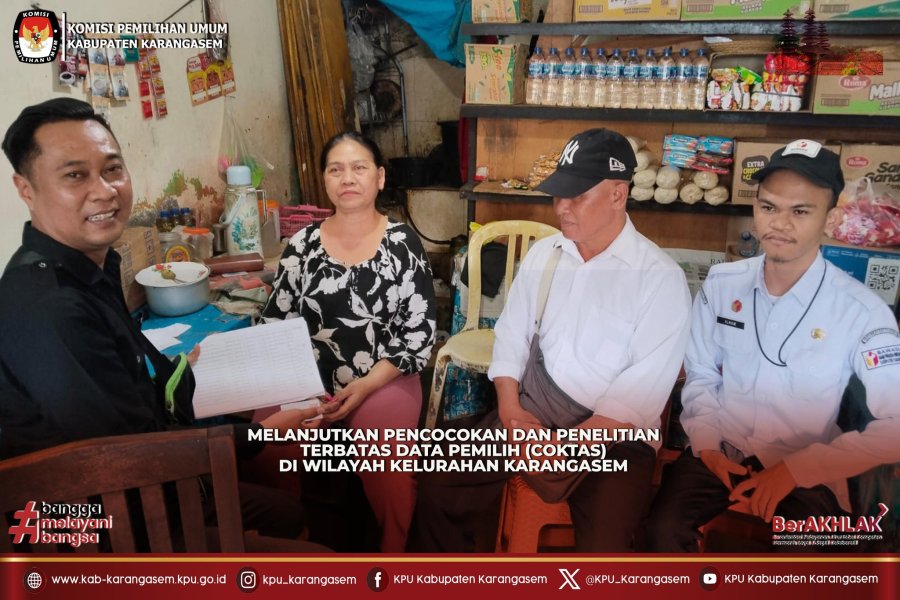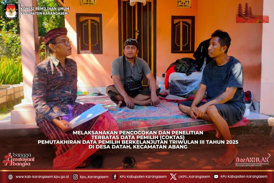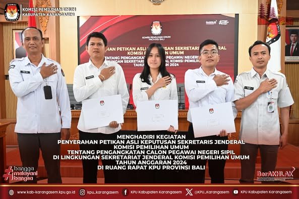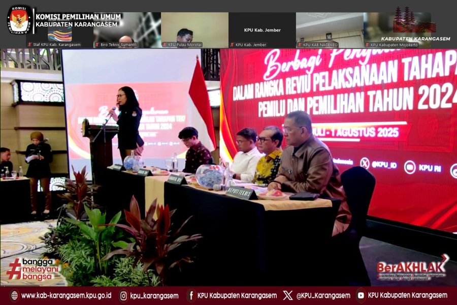 Anggota KPU Kabupaten Karangasem, I Wayan Suartika bersama Kepala Sub Bagian Teknis Penyelenggaraan Pemilu dan Hukum KPU Kabupaten Karangasem, I Nyoman Orta Susila dan Staf, Radhitya Kurniatama hadir pada kegiatan tersebut secara luring dan daring.