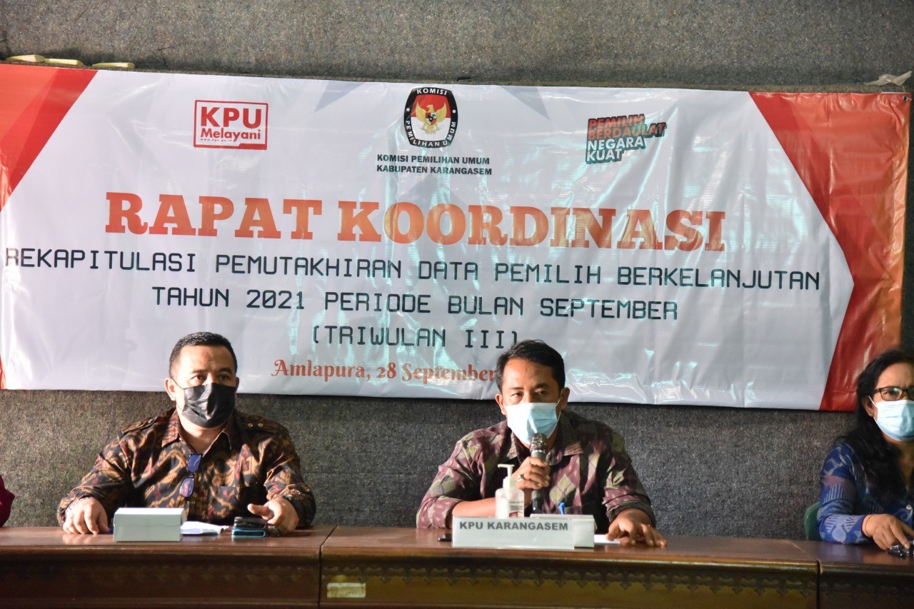 Memasuki Triwulan III tahun 2021, Komisi Pemilihan Umum Kabupaten Karangasem menggelar Rapat Koordinasi Pemutakhiran data Pemilih Berkelanjutan, Selasa (28/9) Anggota KPU Karangasem Divisi Perencanaan Data & Informasi, I Gede Krisna Adi Widana menyampaikan hasil pemutakhiran yang telah dilakukan pihaknya menemukan pemilih baru sejumlah 128 Pemilih,terdiri dari Laki Laki sebanyak 60 dan Perempuan 68, Tidak Memenuhi Syarat 72 Pemilih terdiri dari Laki Laki 49 dan Perempuan 23 Pemilih. Sehingga jumlah Daftar Pemilih berkelanjutan di Karangasem sebanyak 375.973 pemilih dengan rincian Laki Laki 189.606 dan Perempuan 186.367. Data tersebut juga telah berdasarkan masukan dari berbagai pihak. "Sehingga melalui proses pemutakhiran yang telah kami lakukan menghasilkan data tersebut," ungkap Krisna Perwakilan Partai Demokrat, I Komang Jawi mengapresiasi kinerja KPU yang terus berupaya melakukan pemutakhiran data pemilih berkelanjutan. "Saya sangat mengapresiasi rekan - relan KPU yang telah bekerja maksimal," Sementara itu dari Perwakilan Partai Golkar, Wayan Sekep Ariana mengharapkan agar Pemerintah Daerah dalam hal ini Dinas Kependudukan dan Catatan Sipil terus berkoordinasi serta bersinergi dengan KPU kaitannya dalam pemutakhiran data Pemilih ini. "Harapannya tentu saja data yang dihasilkan benar- benar valid satu sama lain," ucap Sekep Dinas Kependudukan dan Catatan Sipil yang diwakili Kasi Pemanfaat Data dan Dokumen Kependudukan, Ni Ketut Arini mengatakan pihaknya memang secara rutin telah berkoordinasi dengan KPU, selain itu Disdukcapil telah membuat berbagai program guna melayani administrasi kependudukan hingga ketingkat Desa.Hal tersebut tentu saja guna memperlancar proses pemutakhiran data pemilih yang dilakukan KPU. "kita sudah sering berkoordinasi, dan tentunya kami juga terus berupaya meningkatkan pelayanan administrasi kependudukan," ujar Arini Sementara itu, Ketua KPU Karangasem, Ngurah Gede Maharjana menegaskan bahwa proses pemutakhiran Data Pemilih Berkelanjutan ini telah melalui berbagai proses dan tentunya dengan masukan berbagai pihak terkait. "Untuk itu kami terus mengharapkan dukungan semua pihak untuk bekerja bersama-sama dalam mewujudkan data pemilih yang berkualitas," tandas Ngurah #TemanPemilih, Memasuki Triwulan III tahun 2021, Komisi Pemilihan Umum Kabupaten Karangasem menggelar Rapat Koordinasi Pemutakhiran data Pemilih Berkelanjutan, Selasa (28/9) Kegiatan tersebut dihadiri oleh Bawaslu, Perwakilan Partai Politik, Instansi Terkait serta unsur TNI POLRI Ketua KPU Karangasem, Ngurah Gede Maharjana menegaskan pihaknya terus berupaya melakukan pemutakhiran sehingga dapat menghasilkan data pemilih yang berkualitas, untuk itu sangat diperlukan sinergitas dari berbagai pihak untuk turut serta mengawal prosessnya.