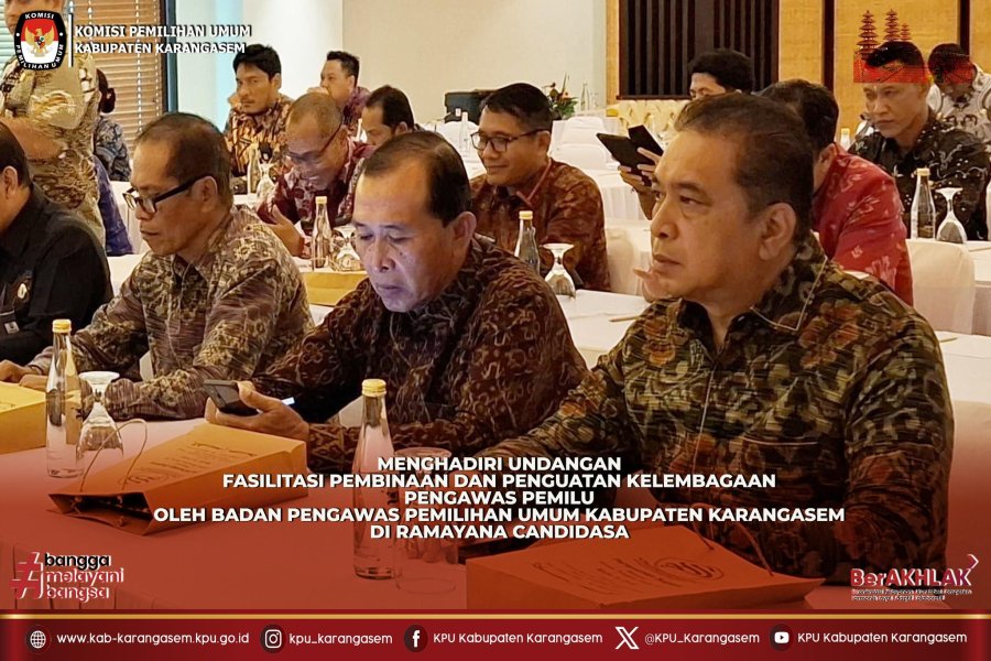 Komisi Pemilihan Umum Kabupaten Karangasem menghadiri undangan Fasilitasi Pembinaan dan Penguatan Kelembagaan Pengawas Pemilu yang diselenggarakan oleh Badan Pengawas Pemilihan Umum Kabupaten Karangasem di Ramayana Candidasa, Selasa (26/8).