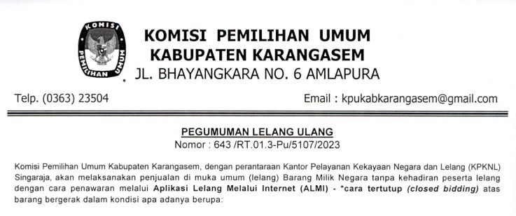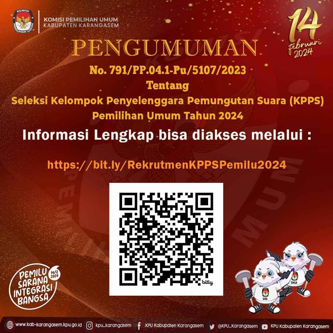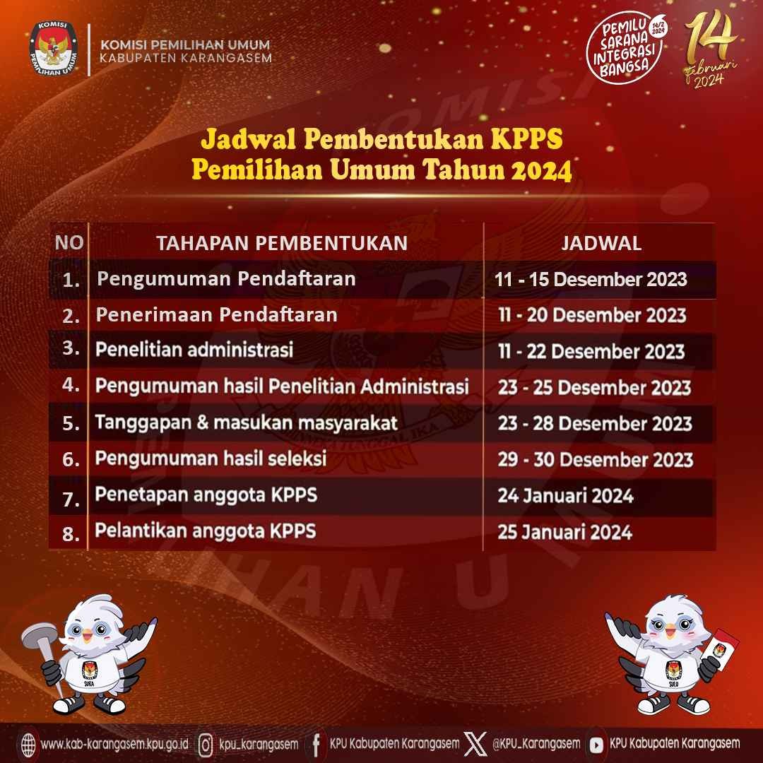 Jadwal Tahapan Pendaftaran dan Persyaratan Dokumen yang disiapkan bisa dilihat pada gambar berikut. Informasi berlanjut terkait rekrutmen KPPS bisa diperoleh melalui Helpdesk Pendaftaran KPPS Pemilu Tahun 2024 di Kantor Komisi Pemilihan Umum Kabupaten Karangasem, Jl. Bhayangkara No.6 Amlapura.