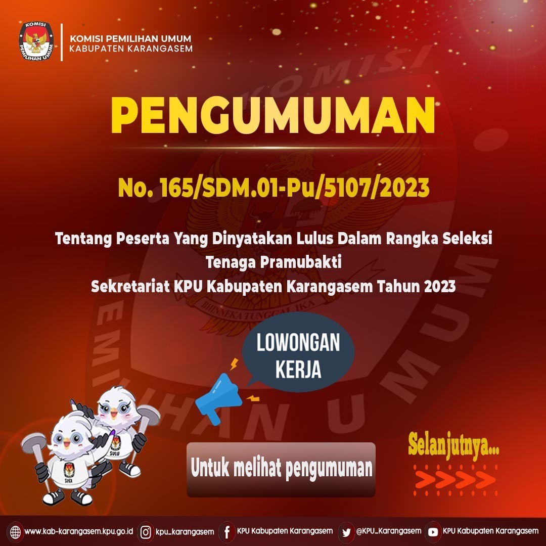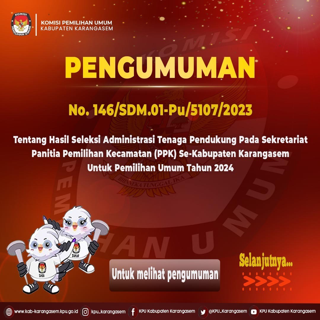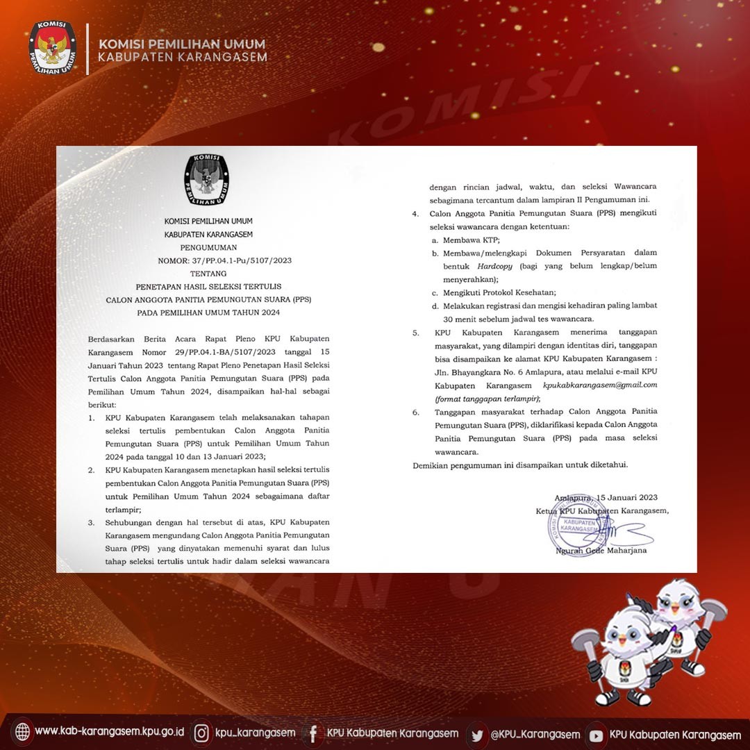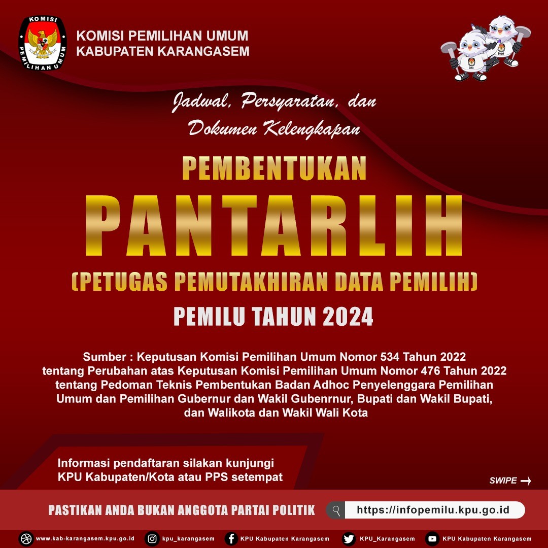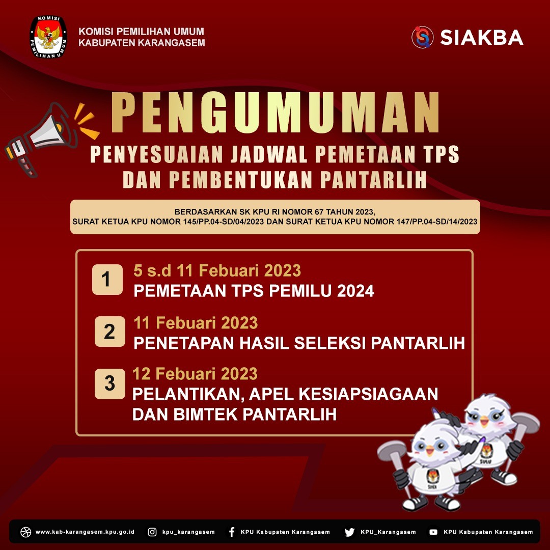 sehubungan dengan diterbitkannya Surat Keputusan Komisi Pemilihan Umum Republik Indonesia No. 145/PP.04-SD/04/2023 dan Surat Ketua Komisi Pemilihan Umum No. 147/PP.04-SD/14/2023, berikut disampaikan Pengumuman terkait Penyesuaian Jadwal Pemetaan Tempat Pemungutan Suara (TPS) dan Pembentukan Panitia Pendaftaran Pemilih (Pantarlih).