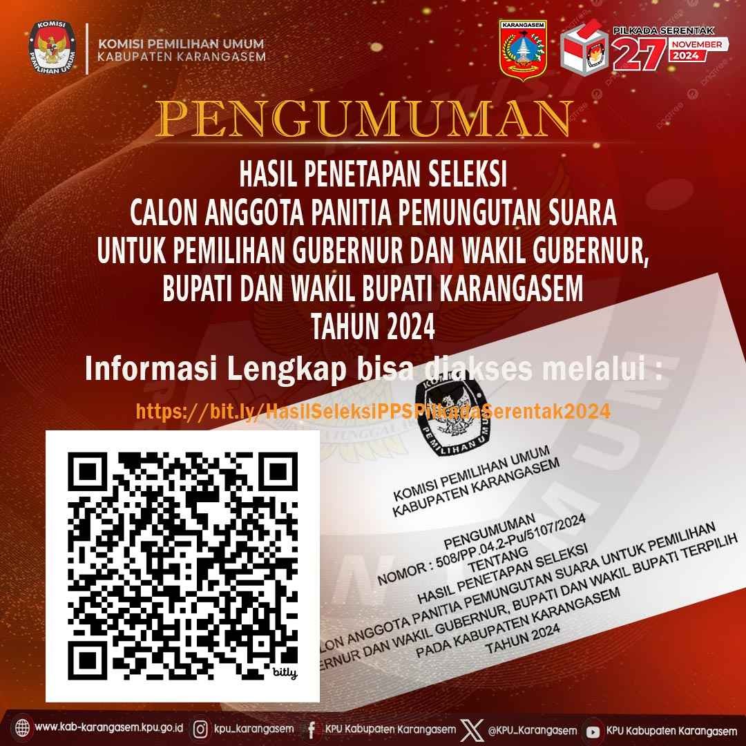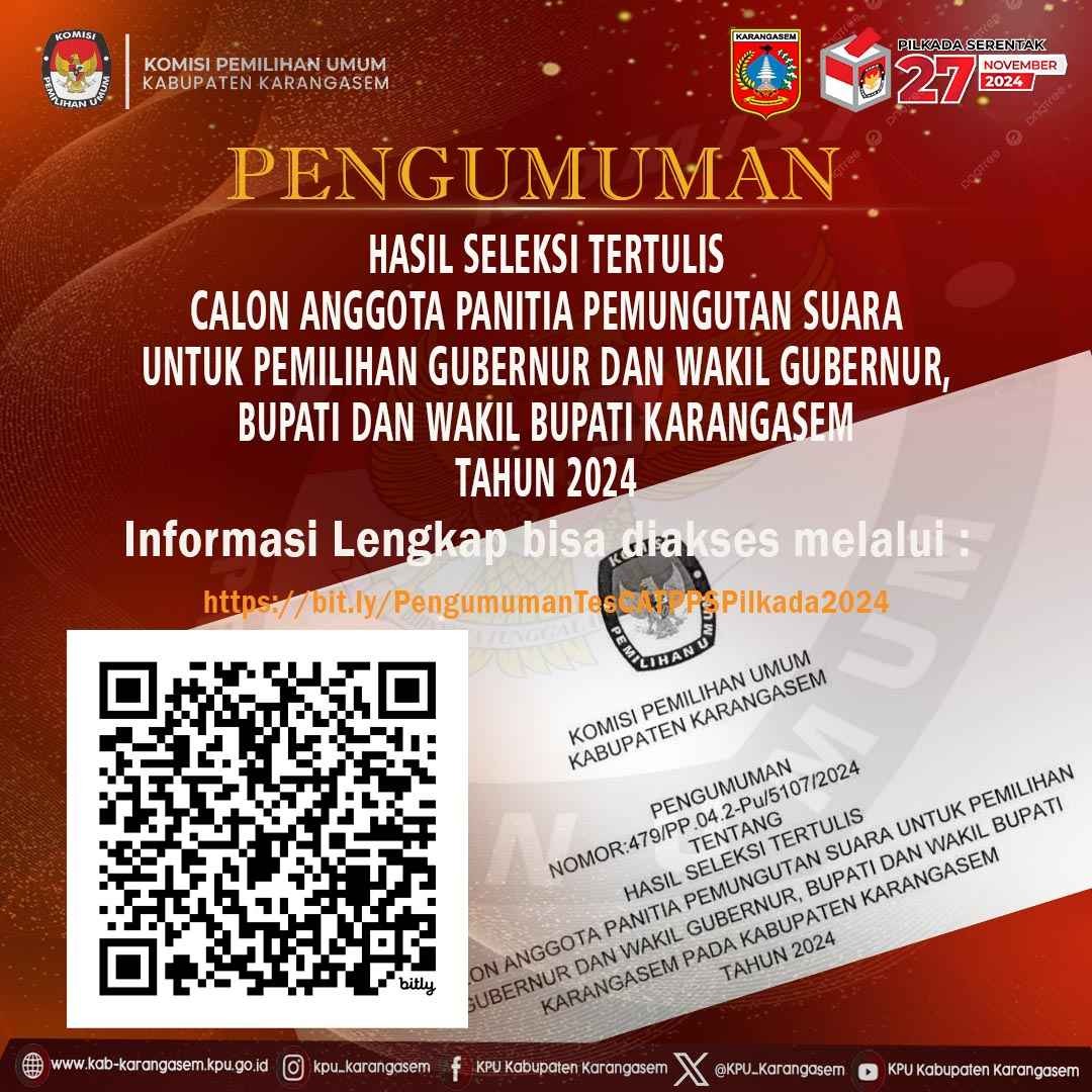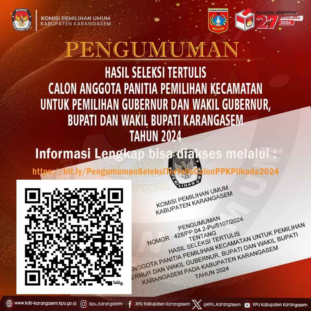berikut disampaikan Pengumuman terkait Hasil Seleksi Tertulis Calon Anggota Panitia Pemilihan Kecamatan untuk Pemilihan Gubernur dan Wakil Gubernur, Bupati dan Wakil Bupati Karangasem pada Pilkada Serentak Tahun 2024.