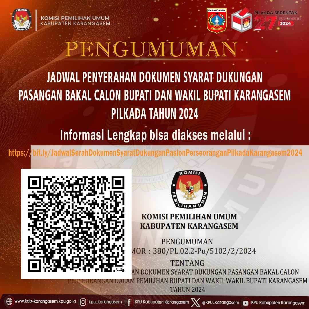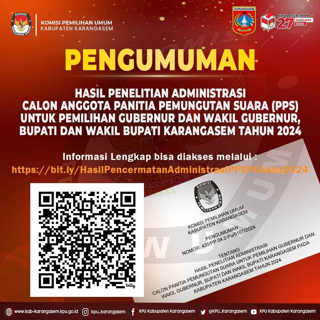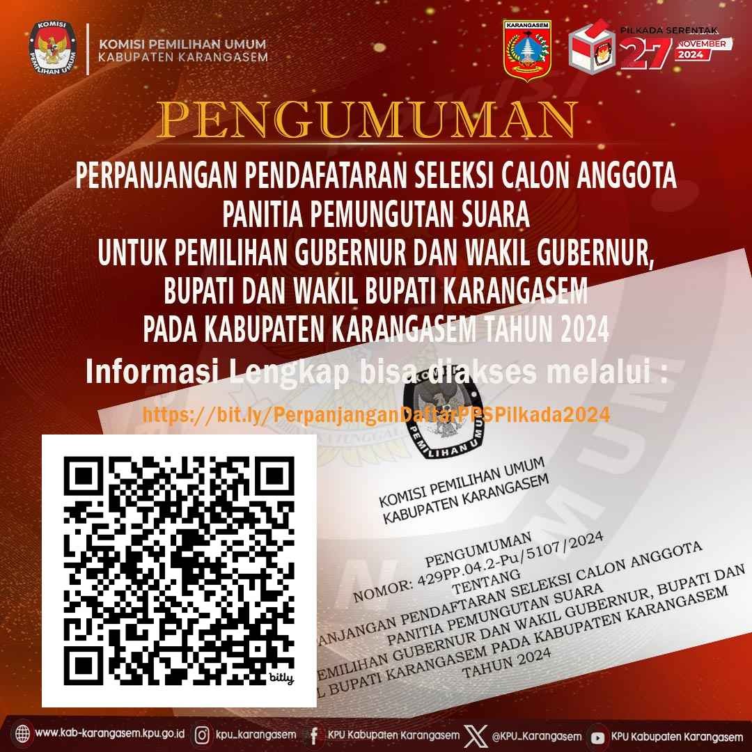 berikut disampaikan Pengumuman terkait Hasil Seleksi Tertulis Calon Anggota Panitia Pemilihan Kecamatan untuk Pemilihan Gubernur dan Wakil Gubernur, Bupati dan Wakil Bupati Karangasem pada Pilkada Serentak Tahun 2024.