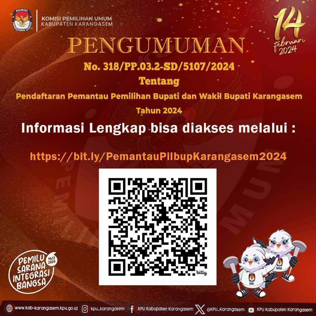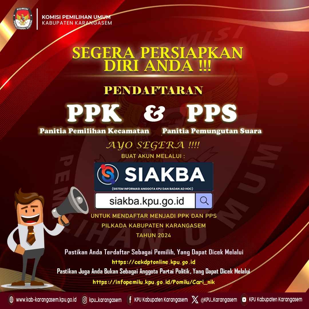 Berikut disampaikan Pengumuman terkait Pendaftaran Panitia Pemilihan Kecamatan (PPK) dan Panitia Pemungutan Suara (PPS) pada Pilkada Kabupaten Karangasem Tahun 2024. Simak informasi selengkapnya pada SIAKBA atau kunjungi Helpdesk Pendaftaran PPK dan PPS Pilkada Karangasem Tahun 2024 di Kantor Komisi Pemilihan Umum Kabupaten Karangasem, Jl. Bhayangkara No.6 Amlapura.