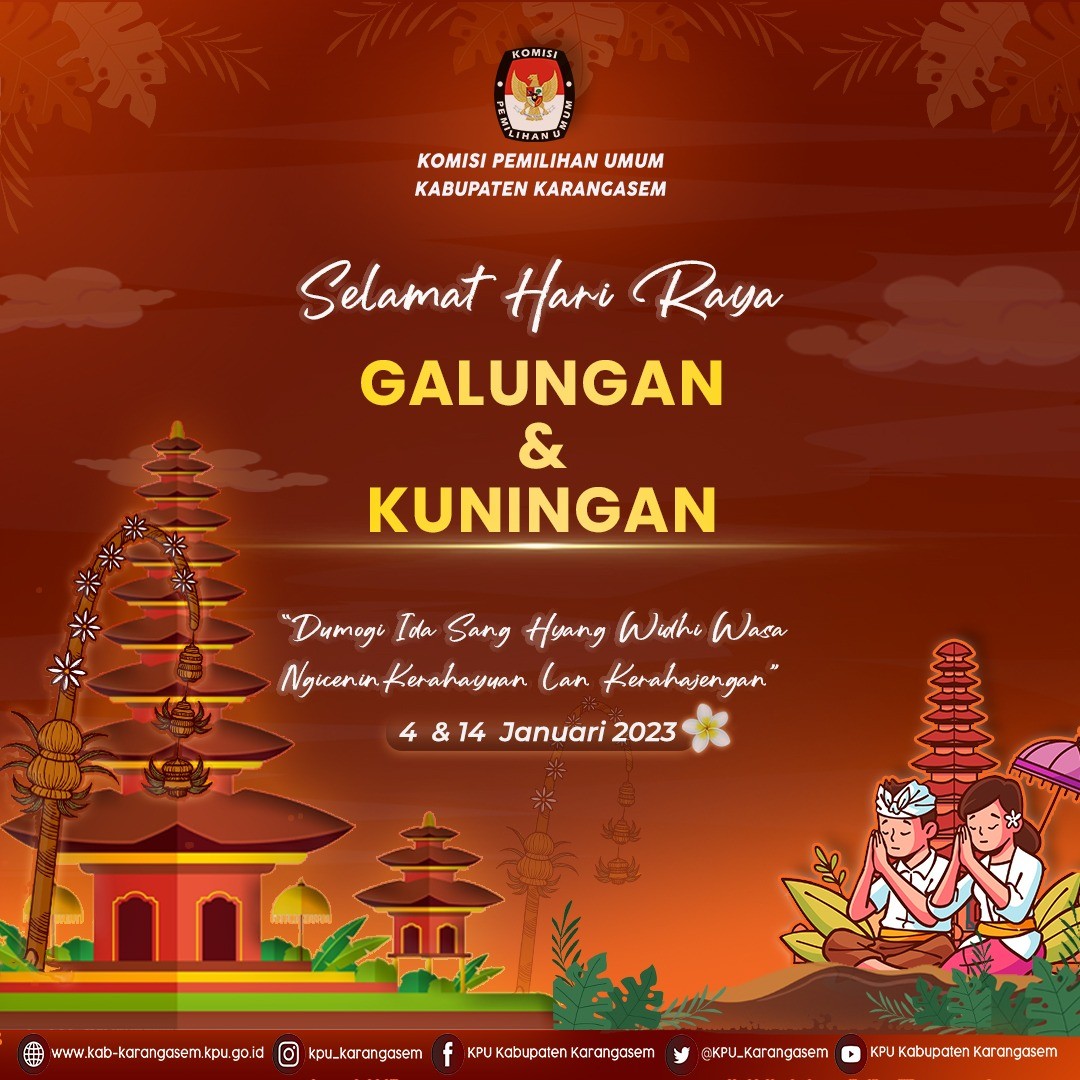 SELAMAT MERAYAKAN HARI RAYA GALUNGAN DAN KUNINGAN Rabu, 04 Januari 2023 05:00 500 Segenap Jajaran Komisi Pemilihan Umum Kabupaten Karangasem mengucapkan Selamat Hari Raya Galungan & Kuningan. Semoga Tuhan Yang Maha Esa memberikan kesejahteraan dan keselamatan bagi kita semua. Baca Selengkapnya